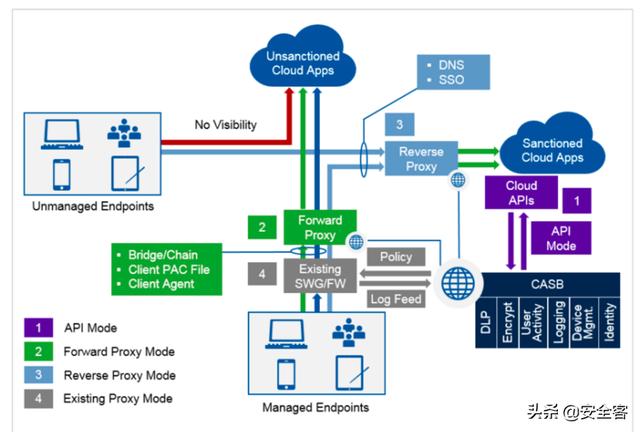 CASB可以通过API、转发代理、反向代理等方式来实现,如下图所示。