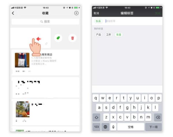 在收藏界面中,向左滑动列表便可以出现「标签」及「删除」符号按键。点击「标签」便可以为该内容选择标签或添加标签。同时,由于微信收藏的空间有限,仅为 2GB。整理笔记的同时,也要及时剔除已经过期的笔记,保证有足够的空间添加新内容。