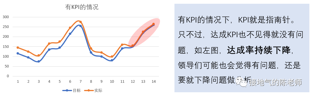 想再深入一些,就得找判断标准。数据 + 标准=判断,有了好坏判断,才能继续往下思考:为啥好/为啥坏。最好的标准,就是有个KPI值压在头上,这样直接对比KPI完成率就有结论。