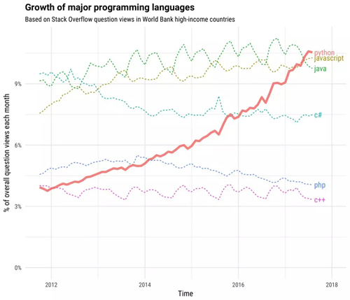 根据 Stack Overflow 流量统计,2017 年 6 月,Python 第一次成为高收入国家 Stack Overflow 访问量最大的标签。