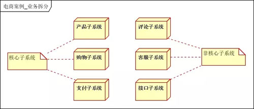 根据业务属性进行垂直切分,划分为产品子系统,购物子系统,支付子系统,评论子系统,客服子系统,接口子系统(对接如进销存,短信等外部系统)。