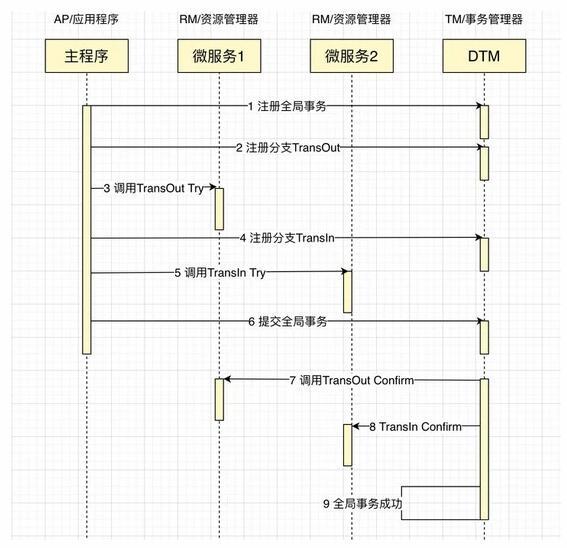 事务开始时,业务应用会向事务协调器注册启动事务。之后业务应用会调用所有服务的try接口,完成一阶段准备。之后事务协调器会根据try接口返回情况,决定调用confirm接口或者cancel接口。如果接口调用失败,会进行重试。