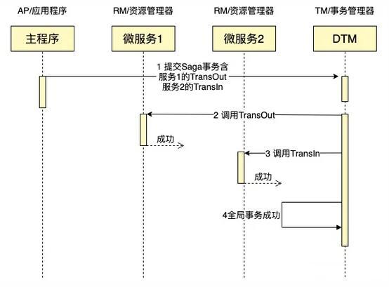 在启动一个Saga事务时,事务管理器会告诉第一个Saga参与者,也就是子事务,去执行本地事务。事务完成之后Saga的会按照执行顺序调用Saga的下一个参与的子事务。这个过程会一直持续到Saga事务执行完毕。