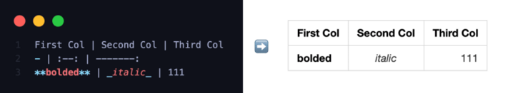 显示排列整齐的数据的好方法。使用**"|"** 符号来分隔列,使用 ":" 符号来对齐行内容。