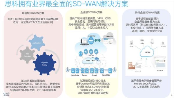 思科软件定义广域网是云交付的重叠广域网架构,可在企业中实现全数字化和云转型。它可以显著降低广域网成本,缩短部署服务的时间,建立应用恢复能力,并为混合网络提供强大的安全架构。内置的vAnalytics功能可提供IT所需的可视性和洞察力,以便及时隔离和解决问题;并为计划和非计划情景提供智能数据分析。