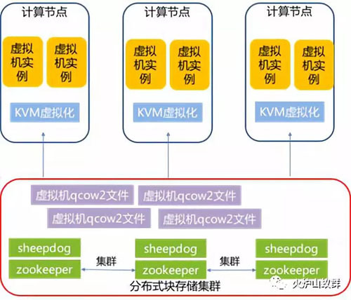 (2)虚拟机的镜像,运行在后端分布式块存储系统上,此系统是基于开源的Sheepdog架构。