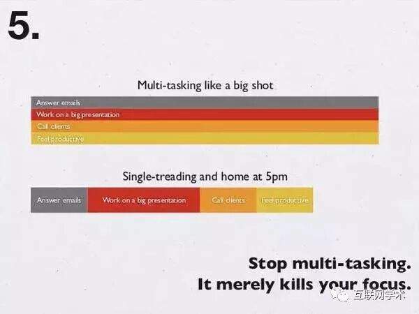 很多人认为同时做很多件可以让自己显得更高效。这在代表科技进步的电脑中叫做“多线程”,可以显著提高电脑并行工作的效率。然而,人脑虽然比电脑要复杂、强大很多倍,但在任务切换以及执行力方面显然不如电脑更有优势。