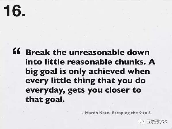 曾经看过一个故事。一个日本的跑者,首次跑马拉松对他来说是一件非常困难而且有点不可能的任务,他想了个办法,比赛前将整条马拉松的路线中特别的标志物标注起来,将42公里分成几公里一段的短线,按照这种方式他在第一次就取得了好的成绩。赛后他提到,对于马拉松而言,我感受到的是一段段几公里的路程,从一个终点到另一个终点,每一个都在我能力范围之内,而且很轻松。