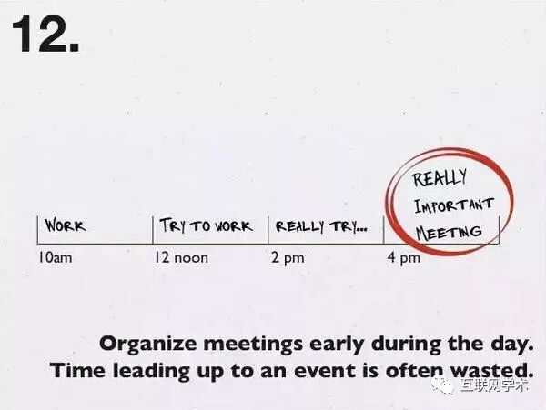 举个例子:自己的工作任务列表上常有10+条待办事项,虽然每天工作到10点是常事,但仍旧有很多事情没有完成,而且有不少事情完成度并不高。除了规划的内容过多之外,每天有很多事情突发的事情需要处理,而这些事情看似简单,处理起来却需要花费不少的精力。这是事实,必须学会接受并以更加明智的方式处理。授权他人(第20点)与调整时间安排是我采取的方案。