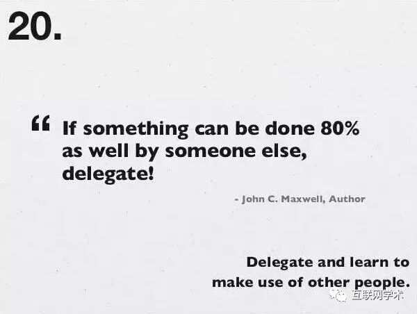 过渡掌控意味着失控。如“第9点”所说:“做,比完美更好”。给自己设定一个标准,按照80%的完成度授权,并接受这样的事实。或许一开始你会觉得失控,但随后你会发现,其实他们的完成度超过你的预期,甚至比你自己做结果更好。否则,一个1000人的大企业不可能只靠老板一个人维持,当然他铁定也无法独自支撑整个企业。