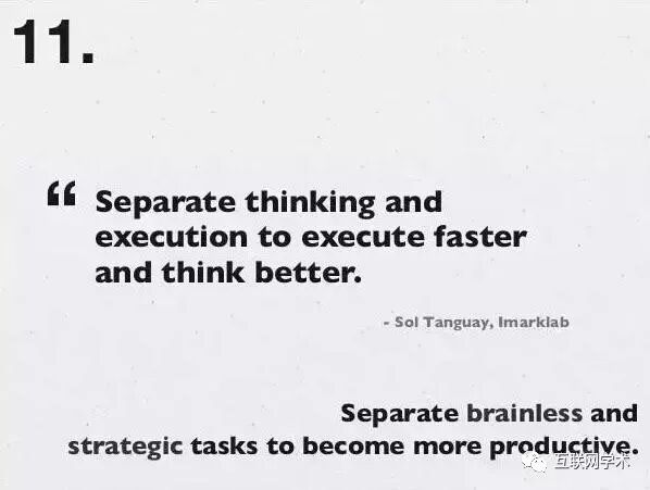 我自己比较赞同:“边思考、边实践”。思考可以为时间提供方向与方法论,实践可以为思考提供反馈与条件。我的理解,题图中所说的分开思考,并不是指我们在思考时不做执行,在执行时不思考。而是在某个阶段重点处理哪个阶段的事情,不要开启自己的“多线程”模式。