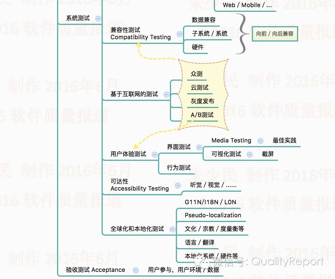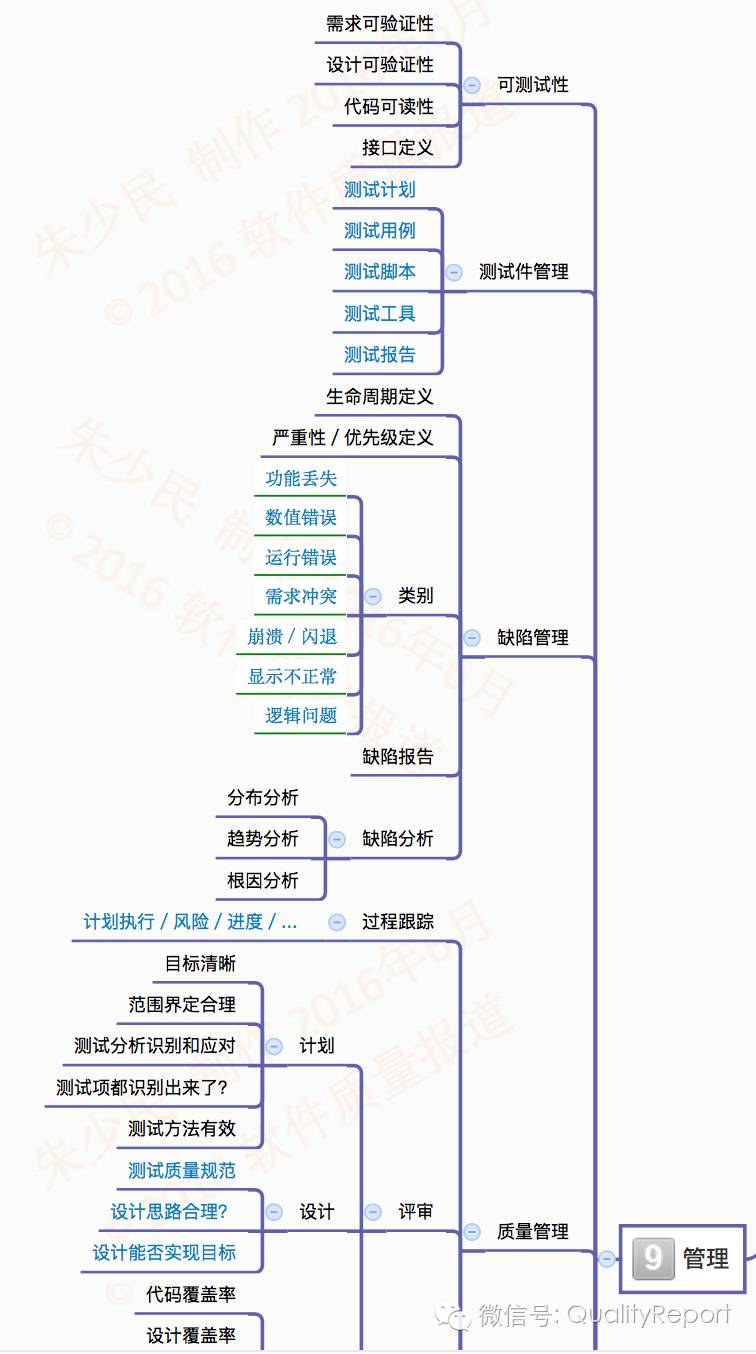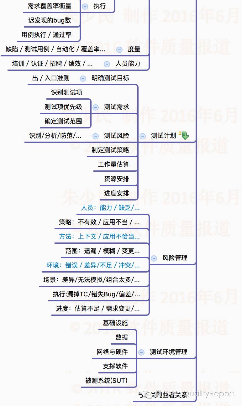 “软件测试全景图”整个思维导图有9个模块,分别是: