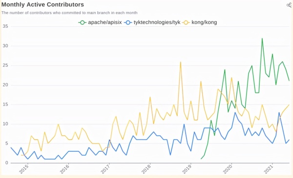 这里我选取了三个项目做对比,ApacheAPISIX、Kong 和 tyk。目前可以看到活跃度最高的是 Apache APISIX,每天都有很多的开发者会参与到 Apache APISIX 的社区中,帮助别人解答问题,或者为 Apache APISIX 提交 PR 等,大家彼此都会在这么活跃的社区中成长和收获。