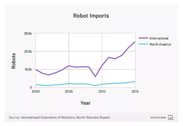 从国际上看,机器人的进口量已经从2000年的10万台左右增长到了2015年的25万台左右。数据来源是每年进口到北美以及国际整体的工业机器人的数量。工业机器人由ISO 8373:2012标准定义。国际数据公司(IDC)预测对机器人的消费将在五年内加快,到2021年达到2307亿美元,复合年增长率(CAGR)为22.8%。