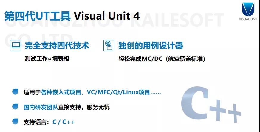 C和C++语言主要用于底层和关键软件,非常需要单元测试。凯乐软件主要业务针对C和C++语言。2014年,VISUAL UNIT 4.0发布,该版本以表格驱动为代表。