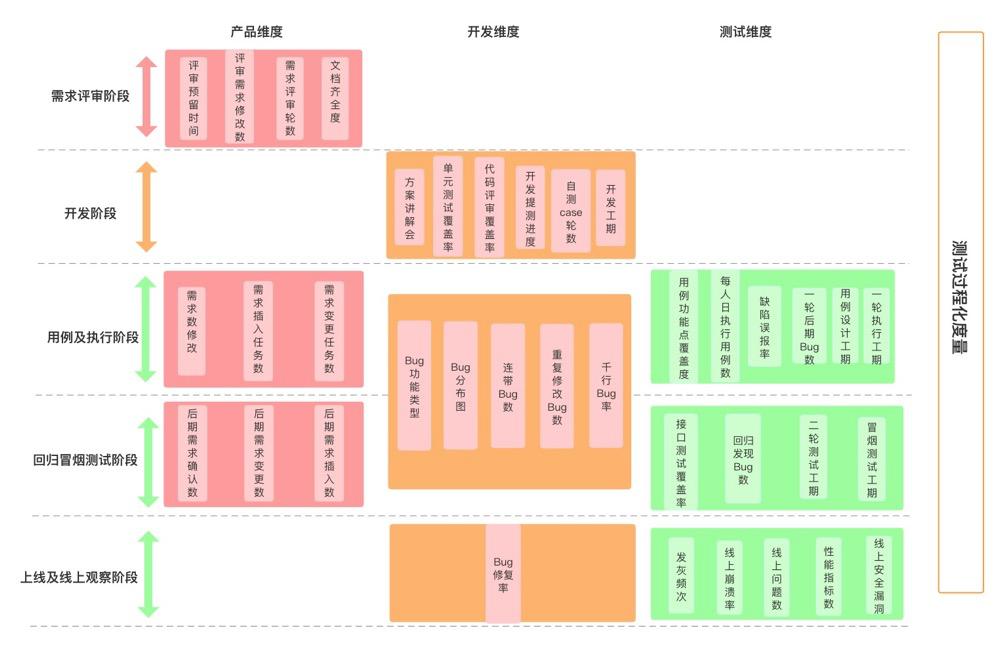 测试过程化度量指标,是依据项目全过程,从产品、开发、测试维度对质量和效率进行评估。