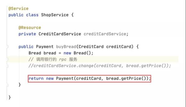 以一段非常简单的程序为例,假设这是一个商店系统,里面有一个买面包的方法,里面会调用银行提供的信用卡服务 creditCardService 来扣除传入的信用卡的钱。这段程序如果使用 Mockito 的话,估计你很快就能写出测试了,只需要把 creditCardService 给 Mock 掉,然后验证它传入的参数就可以了。