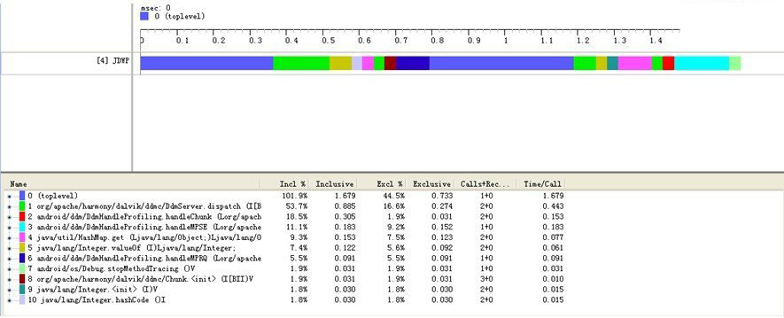 执行上面的命令后,会生成对应的TRACE_FILE,使用adb pull把这个文件拷贝至XP系统上,再在android sdk的tools目录下执行traceview Tracelog,则会弹出一个图形界面,通过这个图形界面就可以分析出应用的性能瓶颈;
